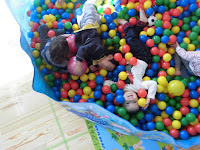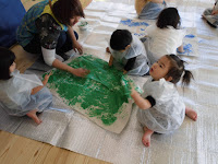ビニール袋をかぶってお手てで、ぬりぬり…鬼さんのお顔つくり